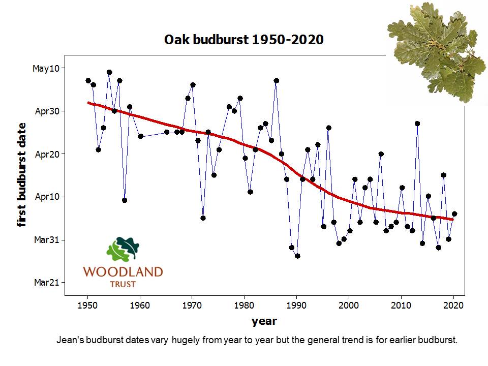 The oak budburst dates collected by Jean have become famous. They have been used by scientists, government departments and research organisations interested in the impact of a changing climate on trees and wildlife. Dates from 1950 to 2017 are shown in the graph below. Budburst dates vary hugely from year to year but the general trend is towards budburst happening weeks earlier than it used to.